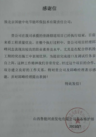 通過河曲EPC項(xiàng)目團(tuán)隊(duì)的共同努力,我司承攬的山西魯能河曲發(fā)電有限公司旁路煙道EPC項(xiàng)目,工程建設(shè)質(zhì)量優(yōu)良,并在項(xiàng)目執(zhí)行過程中,現(xiàn)場團(tuán)隊(duì)表現(xiàn)出較高的職業(yè)素養(yǎng)及水平,受到業(yè)主的一致贊譽(yù),同時(shí)也與業(yè)主建立了良好的合作關(guān)系。