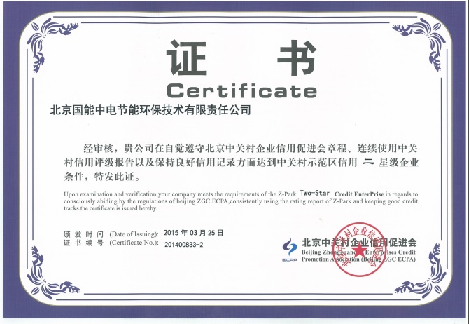 熱烈祝賀我公司榮獲“中關(guān)村示范區(qū)信用二星級(jí)企業(yè)證書”。國能中電已連續(xù)一年保持升級(jí),證明國能中電在信用度方面贏得中關(guān)村管委會(huì)及中國人民銀行的認(rèn)可,企業(yè)融資能力不斷攀升,我公司可享受比例為25%的企業(yè)貸款貼息。